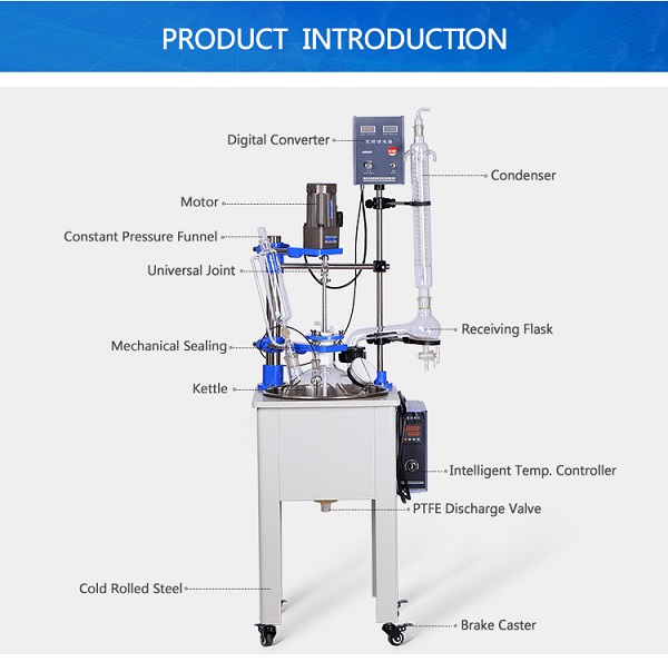 Lò phản ứng thủy tinh được thiết kế bằng thủy tinh hai lớp , lớp lót dành cho dung môi phản ứng và áo khoác để làm nóng hoặc làm mát (chất lỏng, nước nóng hoặc dầu nóng), để đạt được thí nghiệm làm nóng hoặc làm mát tuần hoàn. Và thiết bị phụ trợ của nó để có thể đáp ứng các thí nghiệm phản ứng nhiệt độ cao và thấp.