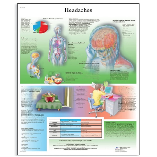 - Biểu đồ bao gồm thông tin về nguyên nhân gây đau đầu và các dạng đau đầu khác nhau. Biểu đồ giải phẫu nhiều lớp dày này được in trên giấy chống tia UV (200 g) bóng cao cấp và đi kèm với cán màng 2 mặt (75 micron).